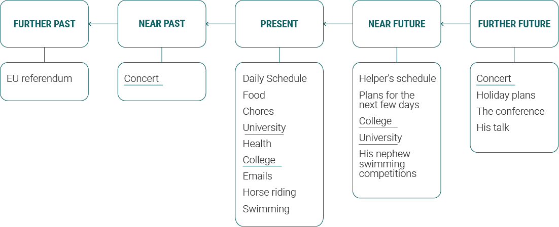 I organised cultural probes under the form of a self-reported diary with one participant. He had to fill a diary template at the end of every day, for a period of one week. The recorded information was related to participant’s daily communication and interaction: date, time, partner and topics. Through analysing the gathered information, a number of patterns and relations emerged. I was able to better understand my user’s communication patterns and to organise his topics into a structure that changes and develops over time.